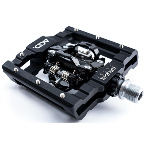 clipless pedal with dual-sided floating clip mechanism; SPD compatible.; CNC machined aluminium body and CrMo axle; large contact surface; low-profile design; seven replaceable and adjustable anti-slip pins per side; sealed cartridge friction bearing and two sealed cartridge bearings
