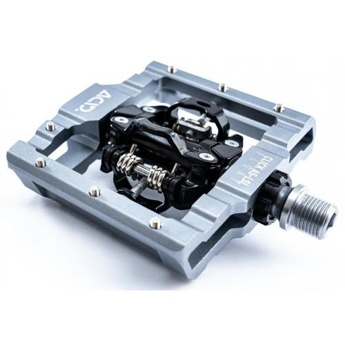 clipless pedal with dual-sided floating clip mechanism; SPD compatible.; CNC machined aluminium body and CrMo axle; large contact surface; low-profile design; seven replaceable and adjustable anti-slip pins per side; sealed cartridge friction bearing and two sealed cartridge bearings