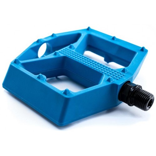 light flat pedal; nylon-reinforced composite body and CrMo axle; chamfered edges for improved cornering clearance; large contact surface; low-profile design; 12 anti-slip pins per side; ball bearing mounted